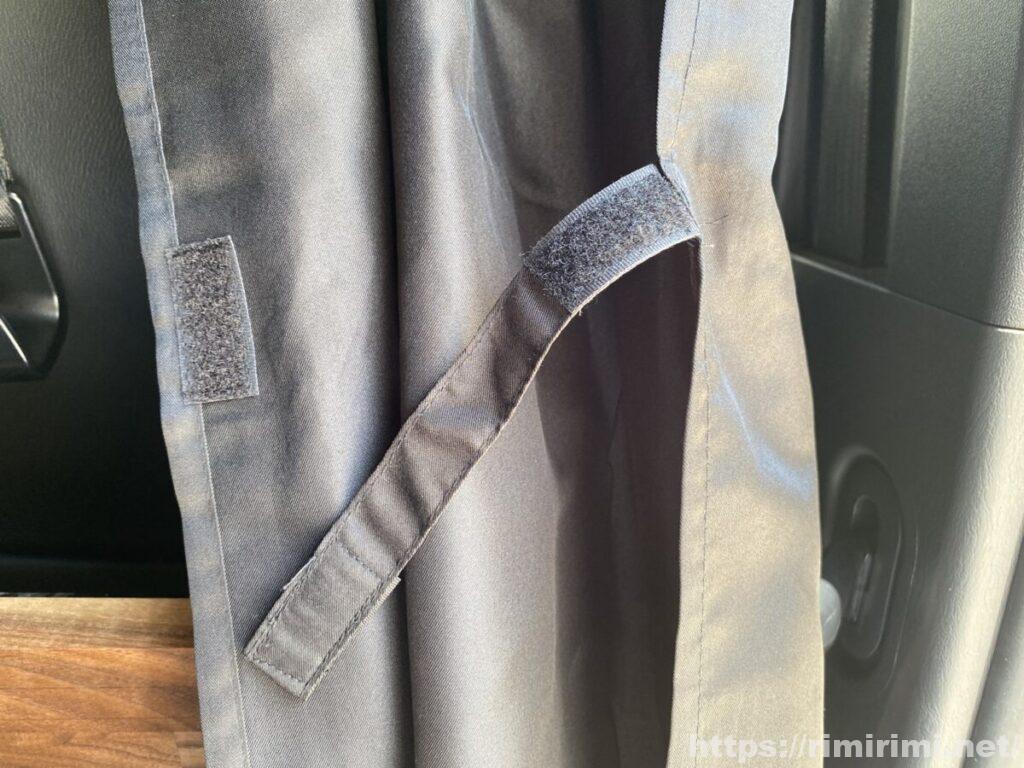 左右のカーテンにはそれぞれマジックテープ付きのベルトがあるので、使わない時はベルトでまとめて端のほうへ寄せてあります。