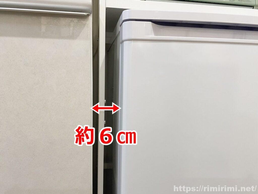 右隣の大きい冷蔵庫をもう少しずらせば更に隙間を広げることもできますが、我が家のキッチンスペース的に限界なのと、隙間が空きすぎて見栄えが悪くなるのでこのくらいにしています。