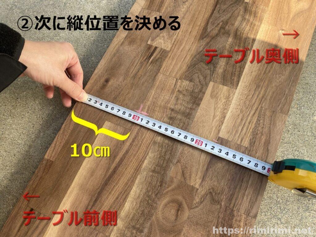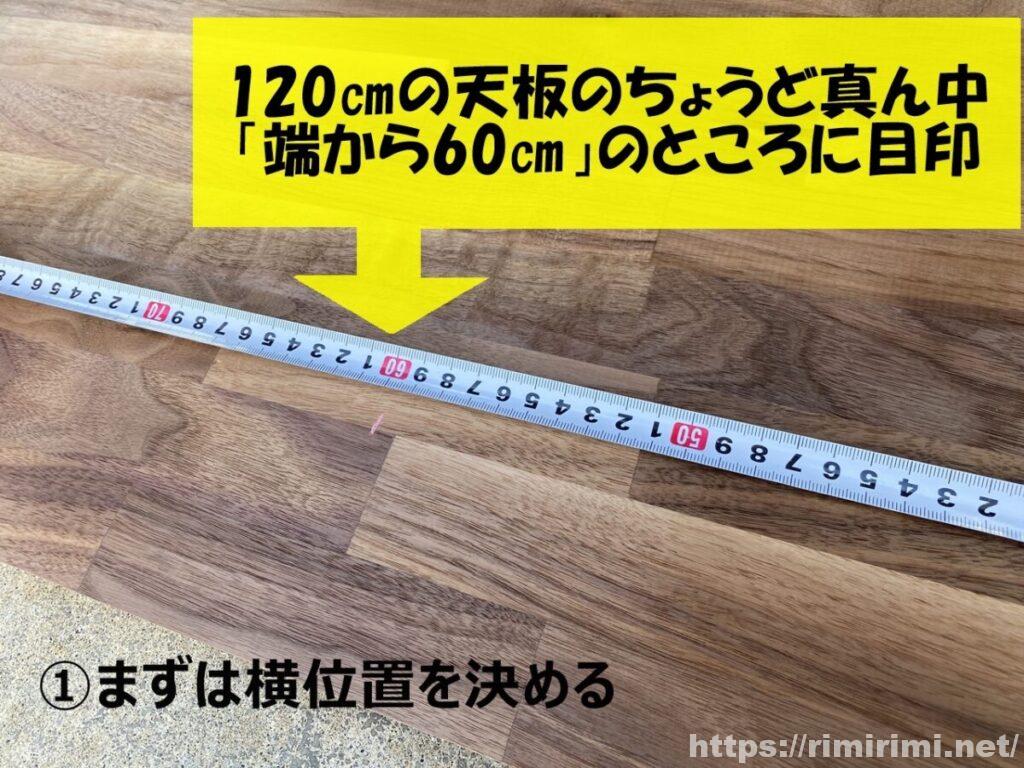 幅120㎝の天板なので、そのちょうど真ん中となる端から60㎝のところに目印を書きました。