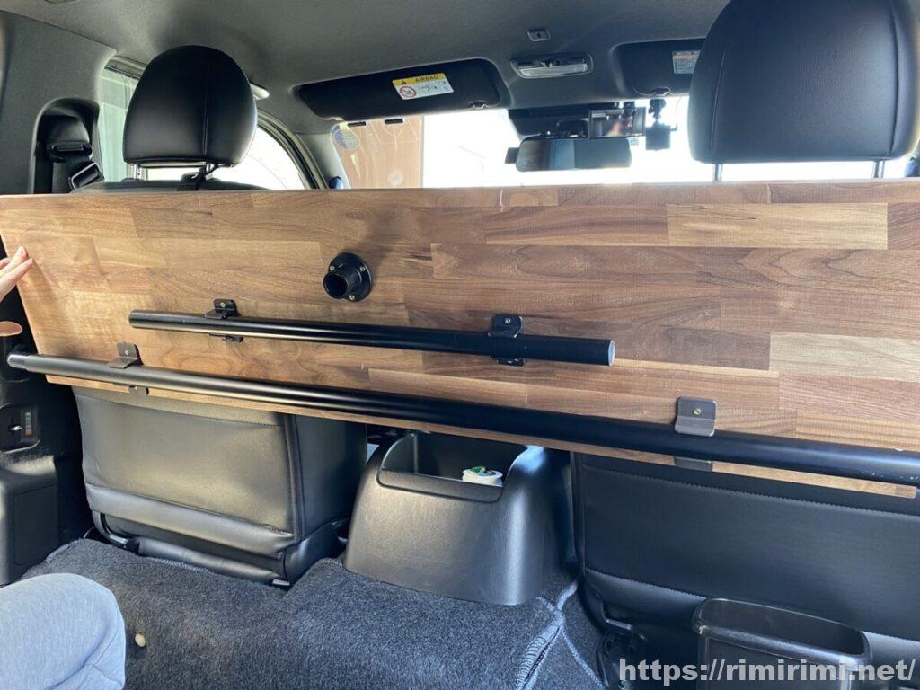 - 天板をハイエースのセパレートバーに引っかけて、イレクターパイプを差し込めばセカンドテーブルの完成です(*^^)v
