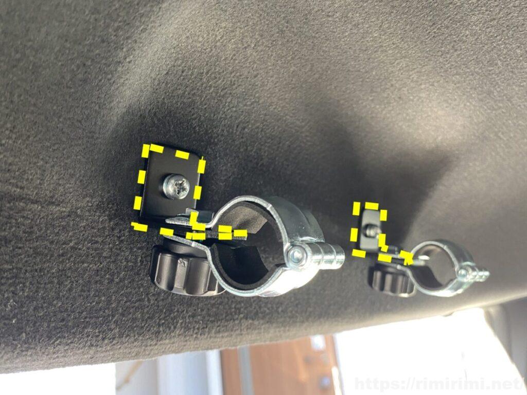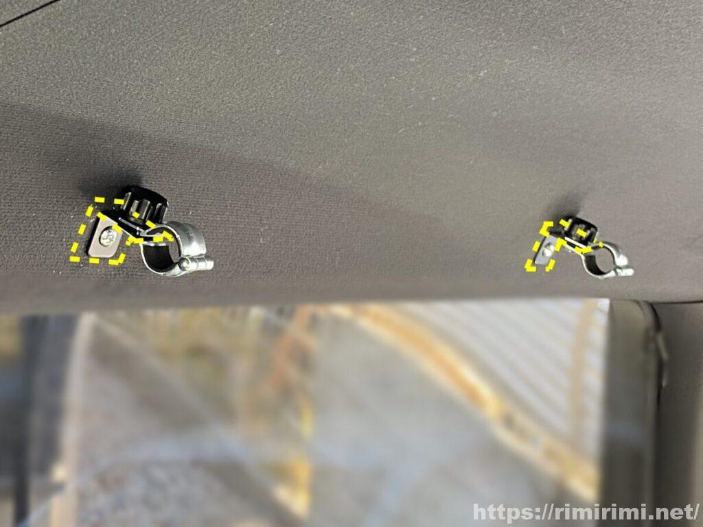 後方の天井内張りを少しめくって覗くと、先ほど内張りクリップを外した2か所にステー(車両側にもともと付いている金具)があるのが見えます。