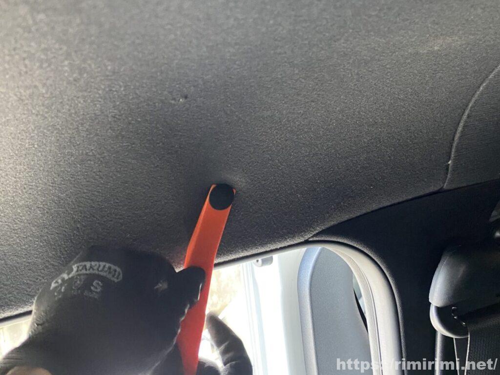次に、内張りはがしを使用して、内張りクリップ(天井にいくつかある丸いボタンみたいなポッチリ)を外します。
