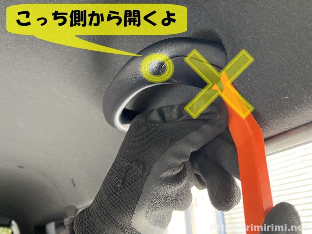 まずは、サイドバー用の固定金具を車に取り付けるために、アシストグリップ(手すり)と内張りクリップを取り外します。
