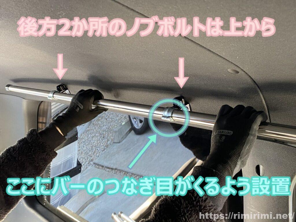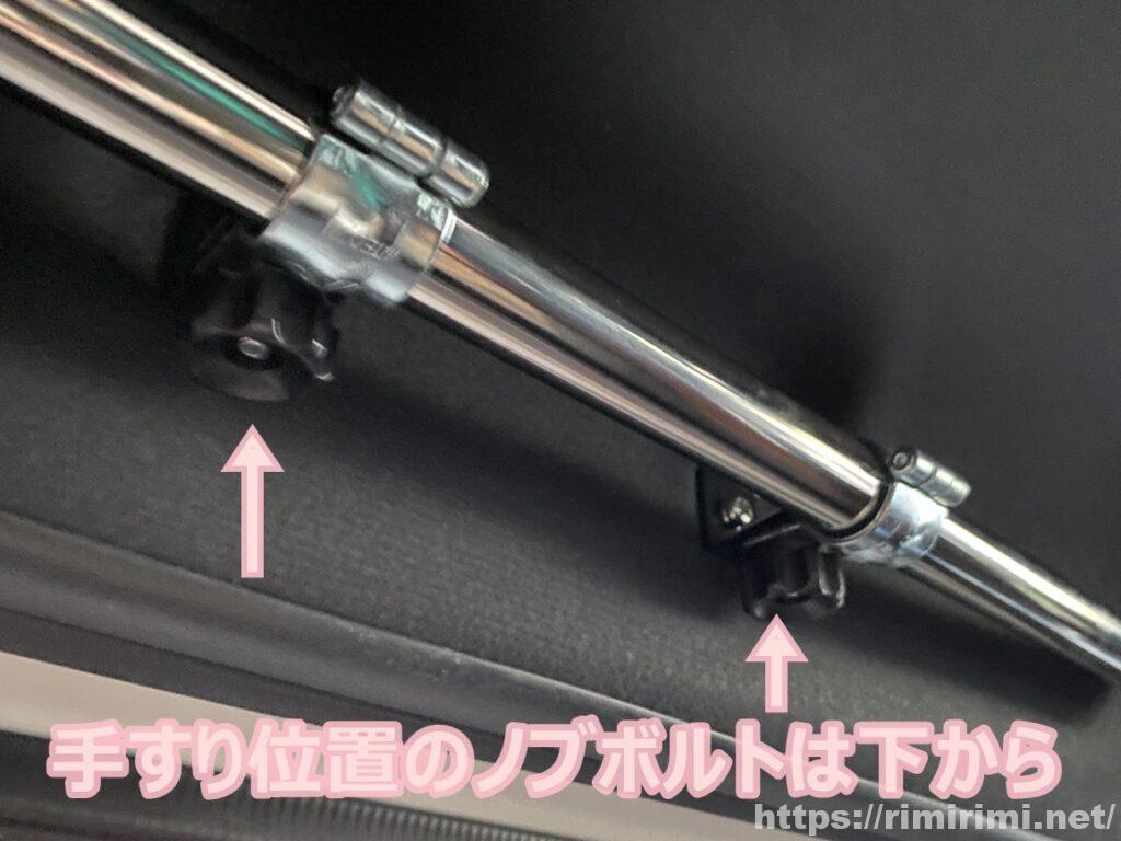 ノブボルトは、後方2か所(L字金具を逆さまに固定してあるところ)は上から差し込み、アシストグリップ位置は下から差し込むようにします。